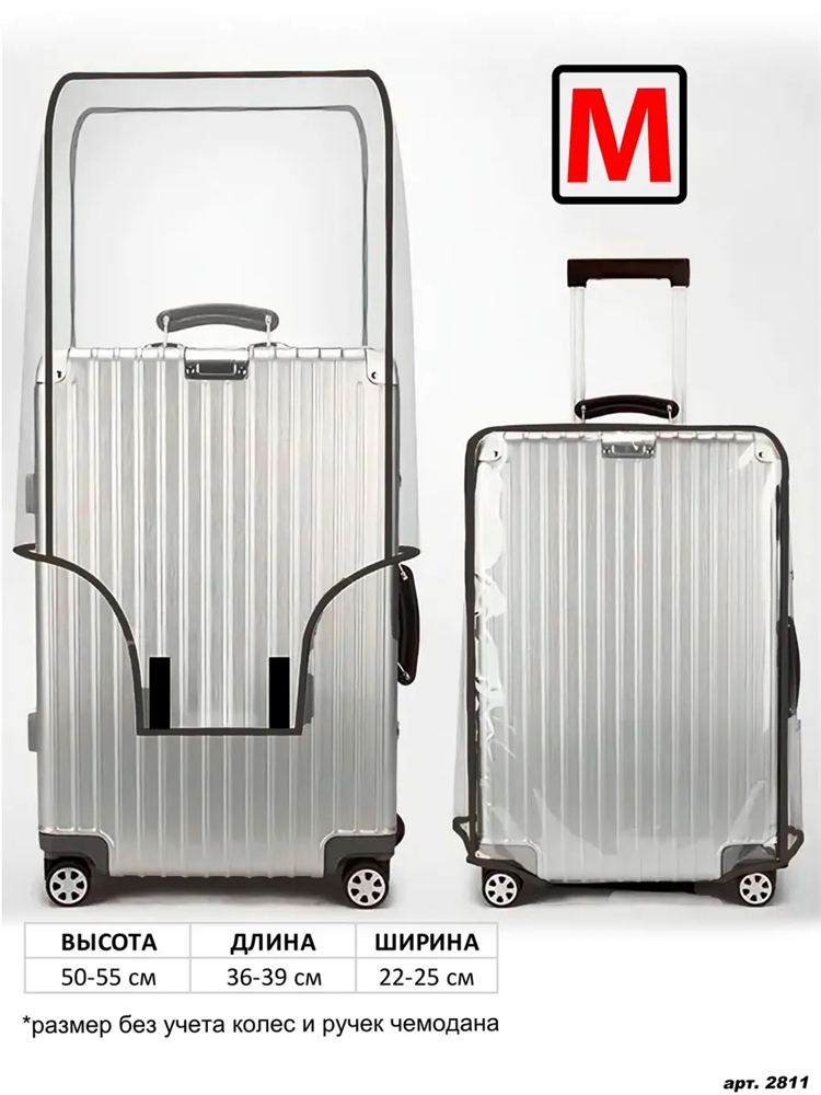 Плотный и прочный чехол для чемодана на колесах размерами без учета колес: высота 50-55 см, длина 36-39 см, ширина 22-25 см. Он подходит для разных размеров: М. Чехлы представлены в вариантах как для дорожного, так и на детский лад, а также доступны на молнии, что обеспечивает удобство и безопасность использования.
