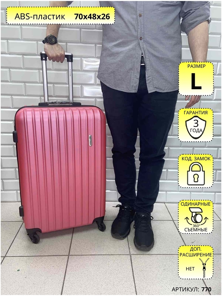 Чемодан на колесах из пластика с Гарантией 3 года. Сборка Россия. Ручка выдвижная металлическая , 3 положения на любой рост, а мягкая доп. ручка очень приятна на ощупь. Колеса 4 шт, прорезиненные и тихие, на стальных подшипниках , вращение 360 градусов. Замок кодовый. Внутри: ремни держатели, карманы на молнии. Габариты указаны с учетом колес. Подробные характеристики на главном фото. Подходит для путешественников всех возрастов и предпочтений. Имеет набор функций. Большой и вместительный, он представляет собой легкий и удобный способ для хранения и перевозки вашего багажа. Этот трансформер используется как сумка дорожная и доступен в различных вариантах, начиная от компактного чемоданчика и заканчивая просторным XXL-вариантом объемом в 120 литров. Благодаря складному дизайну и съемным колесам, он легко превращается в практичный рюкзак или даже сумку-чемодан, как коробка, подходящая для разнообразных ситуаций. Вы можете купить как Л, так и Л+. Отсеки для документов. Материал из АБС ABS пластика обеспечивает ударопрочность и долгий срок службы, а кодовый замок с защитой гарантирует безопасность. Надежный. С четырьмя вращающимися колесиками, он маневрирует с легкостью, обеспечивая комфортное передвижение в любых условиях. Рассчитан как на 20 кг, так и на 23 кг вещей. Для модниц доступны женские модели xl размеров, отлично подойдут для девочек. декорированные стильными аксессуарами и косметикой. Для мужчин предусмотрены мужские модели, сочетающие в себе практичность и элегантность. Комплекты и разные виды позволяют выбрать идеальный вариант для любого путешествия. Сумка-чемодан каталка на колесиках есть как в L, так и в L+ - это не просто удобный аксессуар, но и стильное дополнение к вашему образу в пути как для подростков так и для мальчика. Пластиковый и легкий, подарит беззаботность и уверенность в сохранности вашего багажа.