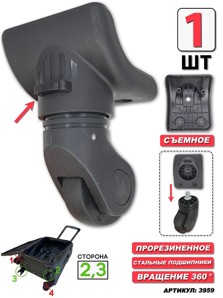 Съемное колесо для чемоданов в сборе (основание+колесо). Вращение 360 градусов, стальные подшипники, прорезиненные. В комплекте идет съемное колесо фирмы миронпен, а также основание-платформа под колесо! Восхитительное и уникальное, колесо для чемодана станет незаменимым спутником в ваших путешествиях. Оно - ответ на болезненный вопрос каждого путешественника: "Что сделать, если сломалось колесо у чемодана?". Думаете о радикальной замене всего чемодана? Нет необходимости! Наше съемное колесо от Mironpan легко заменяется и подходит к большинству моделей чемоданов.