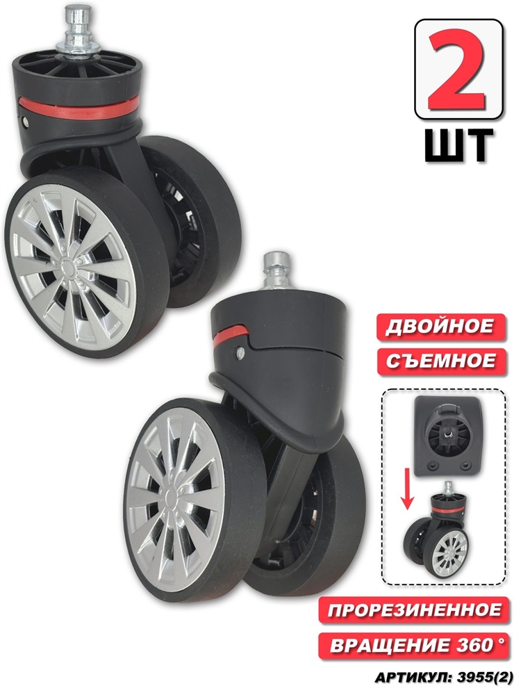 Съемное колесо для чемодана двойное. Размеры указаны на фото. Подходит для большенства моделей, на любую сторону (левую,правую), на любой размер чемодана. Вращение 360 градусов, стальные подшипники, прорезиненные. Колесо для чемодана – это ваш незаменимый помощник в поездках. Заставьте ваш чемодан "ехать как по маслу” с новым съемным колесом для чемодана. Это не просто колесо - это инновационное решение вашей проблемы. Оно идеально подойдет для чемодана любого размера, а благодаря надежному креплению, его установка не займёт много времени и сил.