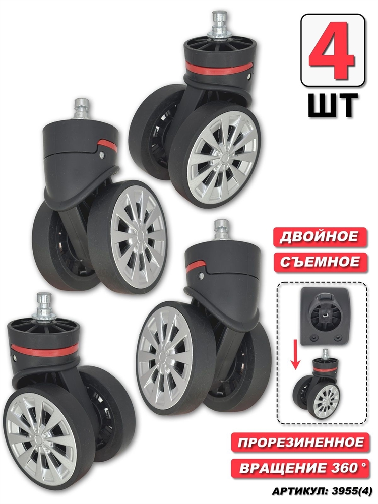 Съемное колесо для чемодана двойное. Размеры указаны на фото. Подходит для большенства моделей, на любую сторону (левую,правую), на любой размер чемодана. Вращение 360 градусов, стальные подшипники, прорезиненные. Колесо для чемодана – это ваш незаменимый помощник в поездках. Заставьте ваш чемодан "ехать как по маслу” с новым съемным колесом для чемодана. Это не просто колесо - это инновационное решение вашей проблемы. Оно идеально подойдет для чемодана любого размера, а благодаря надежному креплению, его установка не займёт много времени и сил.